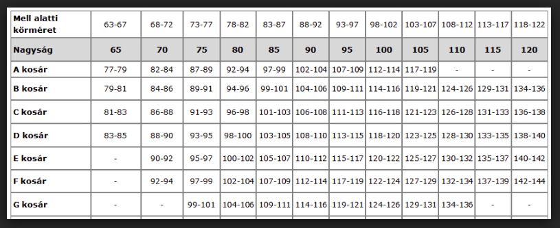 A mellkörüli adatból vonjuk ki a mell alatti adatot, és a kapott száma megadja a kosárméretet: