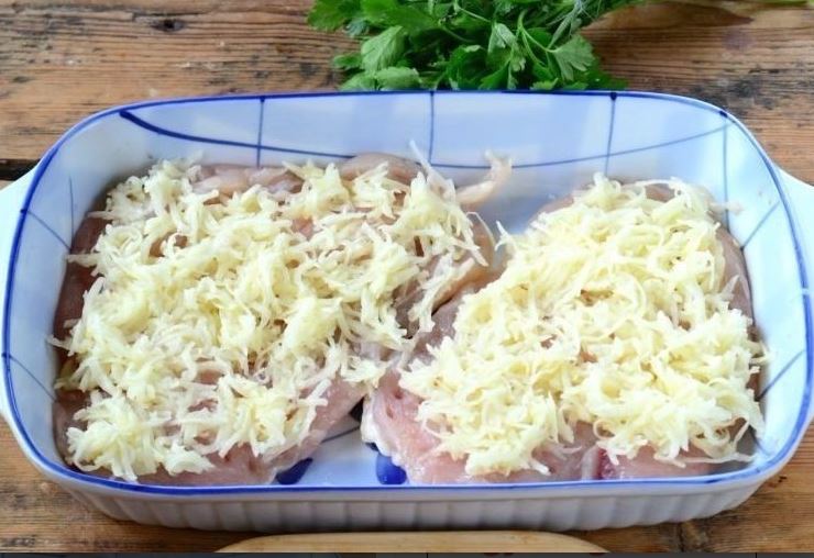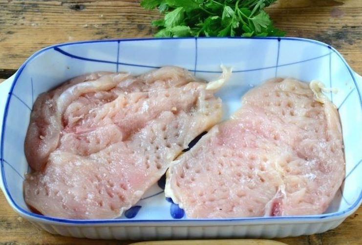A megmosott csirkemellet vágd ketté és enyhén klopfold ki, nem kell túl vékony legyen a hús. Sózd, borsozd meg. A két hússzeletet tedd egy hőálló tálba.
