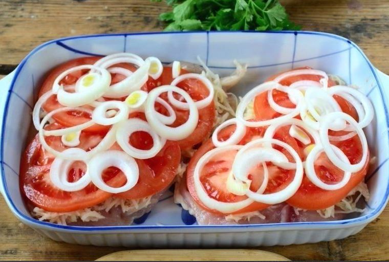 A felkarikázott paradicsomot tedd a tetejére, majd jöhetnek a hagymakarikák.