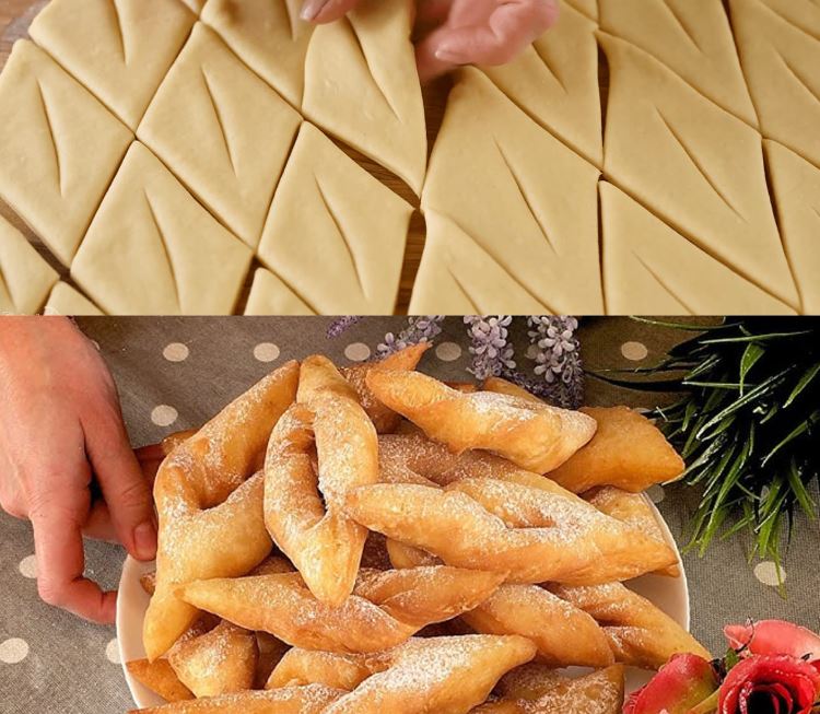 A tojások sárgáját a tejföllel, liszttel, a cukorral és a rummal összegyúrjuk. 20 percig hűtőben pihentetjük. Leveles tészta vastagságúra nyújtjuk. Késsel vagy derelyemetszővel végigvágjuk a tésztát, 4-6 cm széles csíkokra. A hosszú tésztacsíkot 8-12 cm-es darabokra vágjuk. Minden darab közepére vágj egy lyukat. A lyukon húzd át az egyik tésztaszárat, de még jobb, ha mind a kettőt áthúzod. Így érjük el a csöröge jellegzetes formáját.