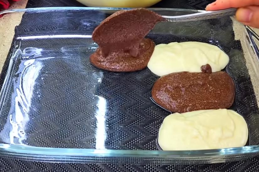 A kiolajozott sütőformába sakktáblaszerűen kanállal adagoljuk a tésztát.