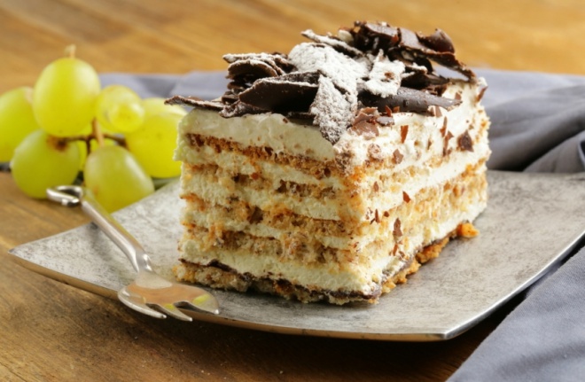 A kekszet mártsuk bele meleg tejbe, és rakjunk le belőle egy réteget. Erre kerülhet a lehűtött töltelék, majd egy újabb sor keksz. Folytassuk addig, amíg el nem fogy az alapanyag. Díszíthetjük tejszínhabbal, és csokireszelékkel.