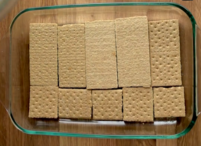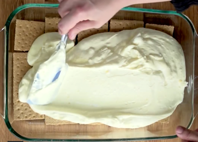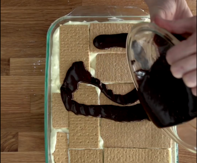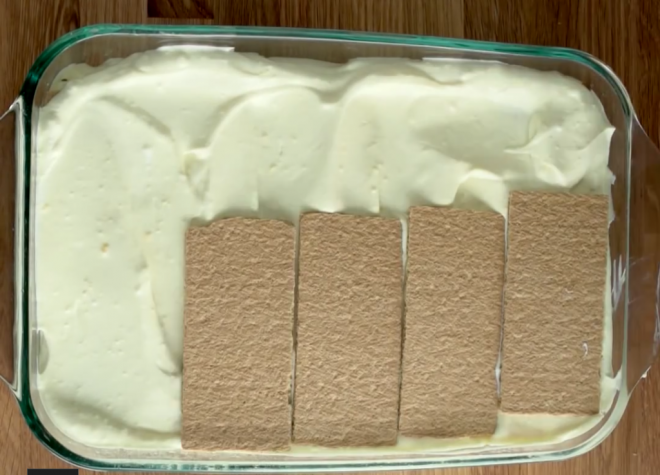 Újabb kekszréteget fektetünk rá, majd arra egy sor krém, és végül keksz.