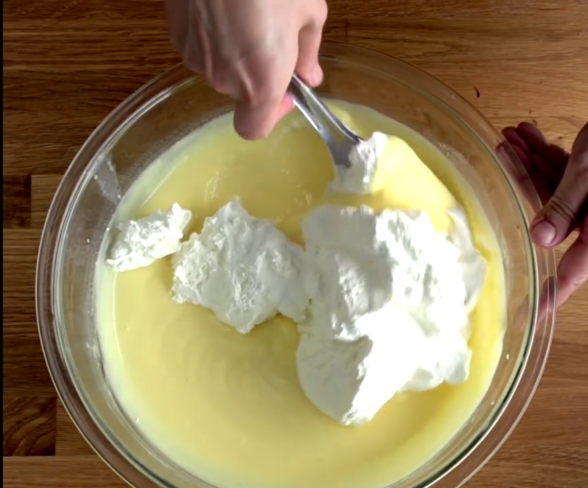 Elkészítjük a pudingot. Hagyjuk kicsit kihűlni, majd belekeverjük a felvert tejszínhabot. Ha magasabbra akarjuk a krémet, nyugodtan használjunk több tejszínt!