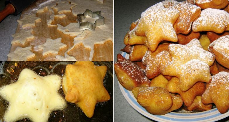 Nyújtsd ki a tésztát 0,5 cm vastagságúra, kiszúró segítségével szaggasd ki a tésztát. Forró olajba süsd aranyszínűre.