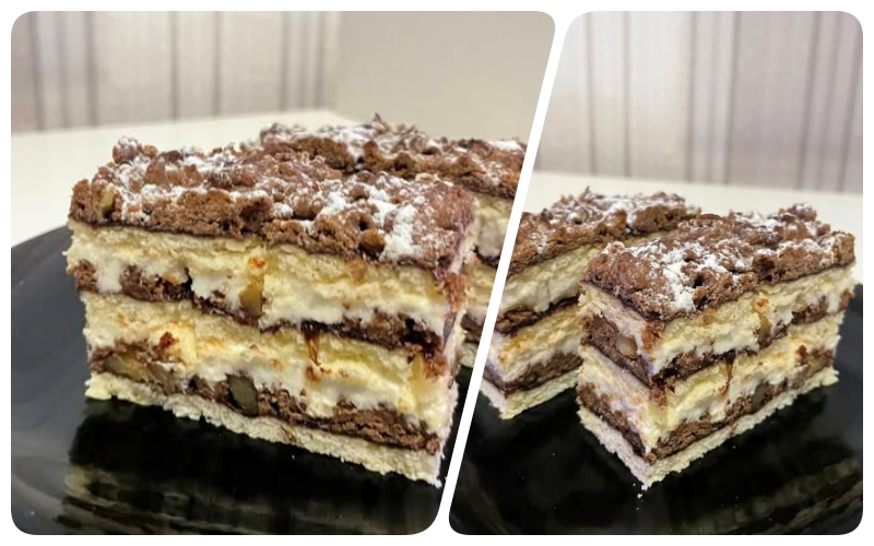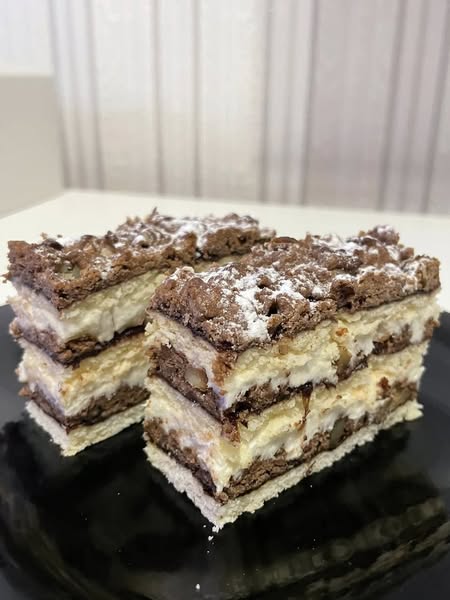 Ha nem akarunk a tetejére krémet, a harmadik lap tetejét porcukorral meghintjük.