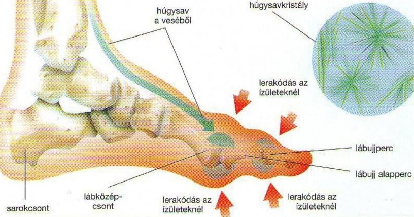 Ha a vesék nem képesek a húgysav lebontására, az kristályosodik, és az ízületek körül lerakódik, amely ízületi gyulladást okoz.