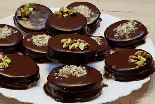 Sütőpapíros tepsiben, 180 fokon sütjük 8-10 percig, majd kihűlés után lekvárral összeragasztjuk kettesével a tésztákat. Én most áfonya lekvárt használtam. Majd felolvasztjuk a csokit az étolajjal és bele mártogatjuk az sütik tetejét.  15 db lett belőle.
