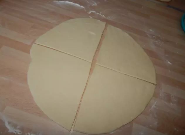 A kész tésztát két részre osztjuk. Az egyiket kerek lappá nyújtjuk, majd elvágjuk 4 részre.