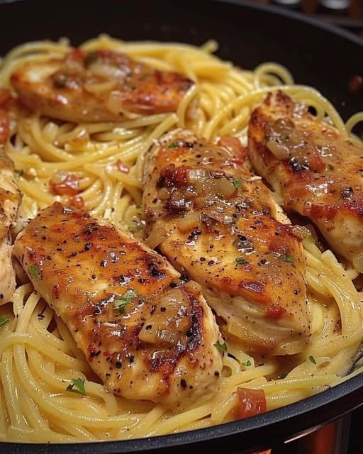 A főtt spagettit a szószhoz keverjük. Majd visszatesszük a csirkét a serpenyőbe és mindent összekeverünk, és felmelegítünk.
