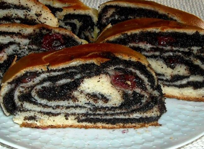 Ha a tészta megkelt átgyúrjuk, majd két részre osztjuk. A tésztákat egyenként kinyújtjuk téglalap alakúra és olyan vastagságúra, amilyen vastag tésztájú kalácsot szeretnénk. Arra figyeljünk, hogy a tészta még kelni fog! Megkenjük a töltelékkel, megszórjuk meggyel, majd feltekerjük.