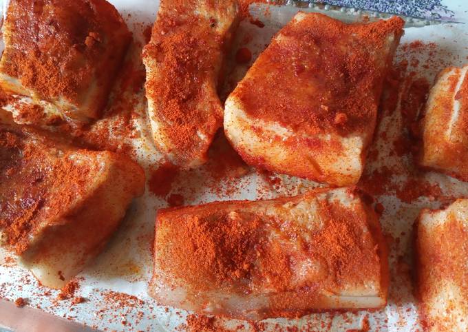 A megmaradt fokhagymát vágjuk apróra, keverjük össze kevés őrölt fekete borssal és kenjük a szalonna tetejére. Aki szereti, pirospaprikát is keverhet a fokhagymához, így szebb lesz a színe.