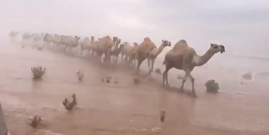 Drámai és egyben lenyűgöző felvételt készítettek két férfiről, akik egy tevecsordát vezetnek egy brutális homokvihar és felhőszakadás közepette a szaúdi sivatag kellős közepén.