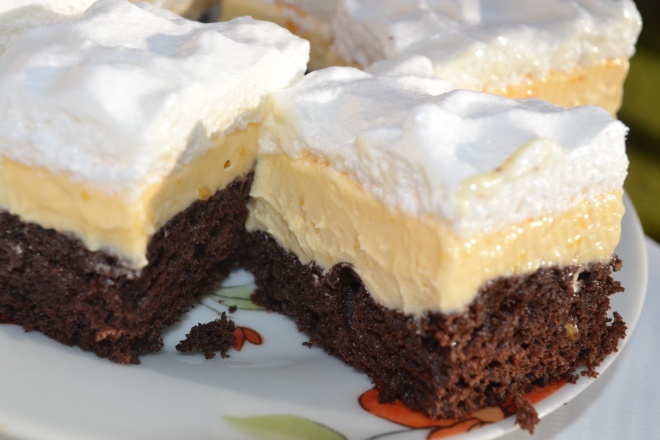 Közben a pudingot a cukorral elkavarjuk, felöntjük a tejjel és megfőzzük, majd kihűtjük. A habot felverjük és hozzáadjuk a habfixet, a vaníliás cukrot és a porcukrot is. Ha a puding kihűlt, összedolgozzuk vele és megkenjük a piskótát. Felverjük a habot, ami a tetejére kerül és bevonjuk vele a süteményt, majd lehűtjük és ezt követően szeletelhetjük.