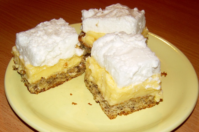 A tojásokat kettéválasztjuk és a fehérjéből kemény habot verünk. A sárgáját kikavarjuk a cukorral, hozzáadjuk a többi száraz alapanyagot is és jól összedolgozzuk. Ha a tészta állaga már megfelelő, akkor beledolgozzuk a tojáshabot és kivajazott tepsibe kanalazzuk, majd 180 fokon sütjük 40 percen át.