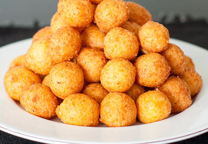 Reszeld le a sajtot. Gyúrd össze a liszttel és a tojásokkal. Ízlés szerint sózd! Kanállal vegyél ki a masszából, és formázd golyóvá. Tedd egy tányérra a kész golyókat.