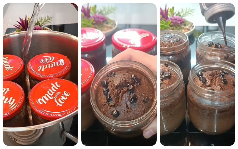 Közepes-alacsony melegen főzd 15-20 percig. Ha úgy főzöl, hogy a kis üvegek teteje nyitott, tekerj egy konyharuhát a fedőre, , hogy a gőz ne csöpögjön rá a sütire.