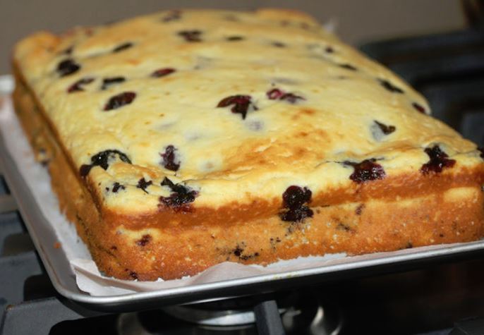 Egy tepsit béleljünk ki sütőpapírral, öntsük bele a masszát. 180 fokra előmelegített sütőben süssük 30 percig. Amikor megsült, vegyük ki a sütőből majd fordítsuk rá az elkészült süteményt egy tányérra. Díszítsük áfonyával és porcukorral. Jó étvágyat. Forrás
